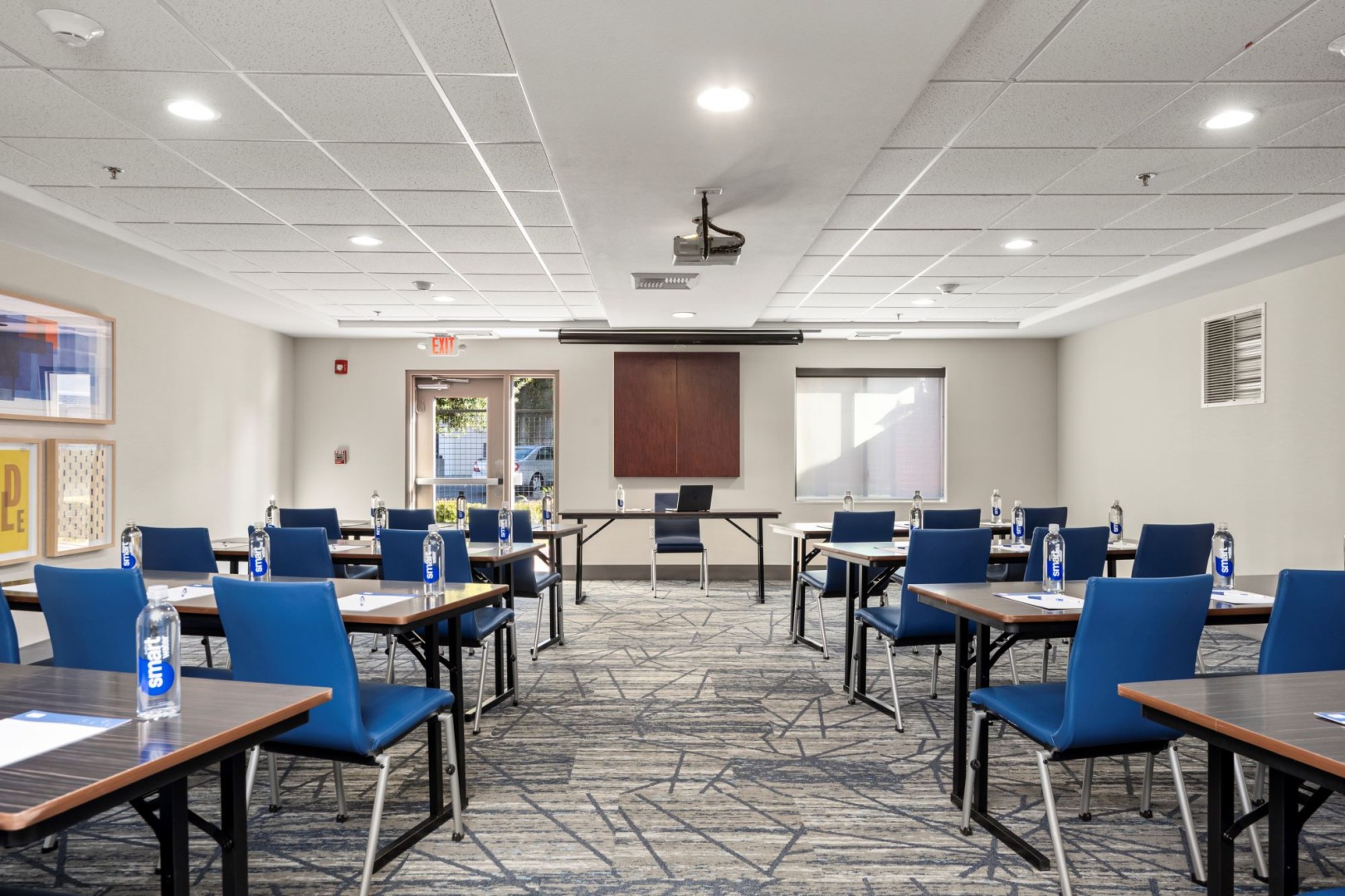 Our meeting room is located on the 1st floor just a few feet away from the restrooms and ice machine. The room is equipped with air conditioning, a projector with screen and a dry erase board. The room has a sink and counter space. Depending on the setup style, we can accommodate 5-60 guests. The room also has a back patio and a large window.