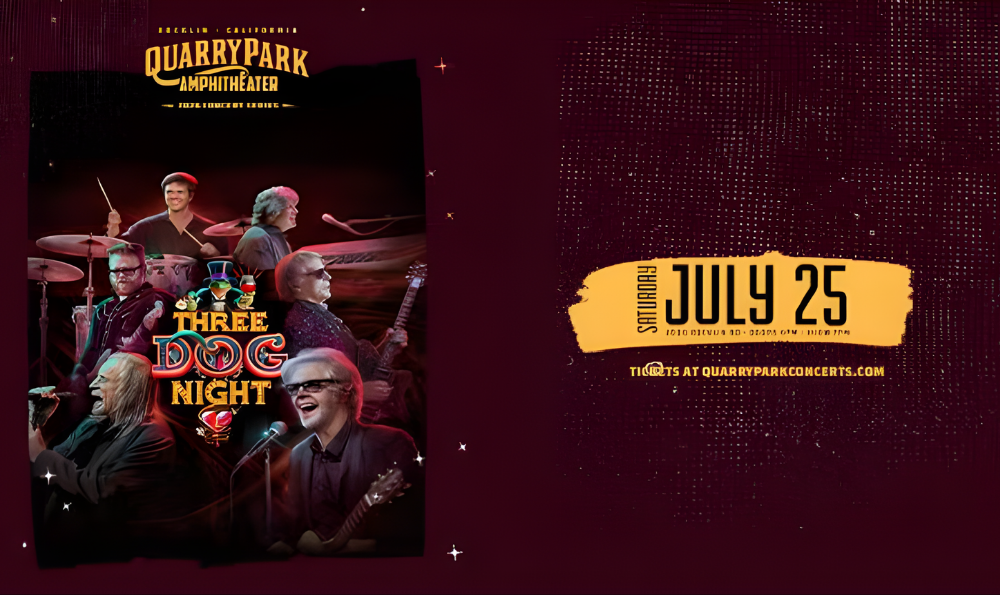 Legendary rock band Three Dog Night is coming to Quarry Park Amphitheatre on Friday, July 25th, 2026. Now in their sixth decade, Three Dog Night dominated the charts from 1969 to 1974 with more top 10 hits, record sales, and concert tickets than any other group of that era. With 21 consecutive Top 40 hits including three number ones like "Joy to the World," "Mama Told Me Not To Come," and "Black and White," plus classics like "Shambala," "One," and "Never Been To Spain," their music has woven itself into pop culture. Over 50 years and nearly 3,000 shows later, they continue to captivate multi-generational audiences with timeless hits. Experience rock and roll royalty under the stars at Rocklin's intimate outdoor venue.